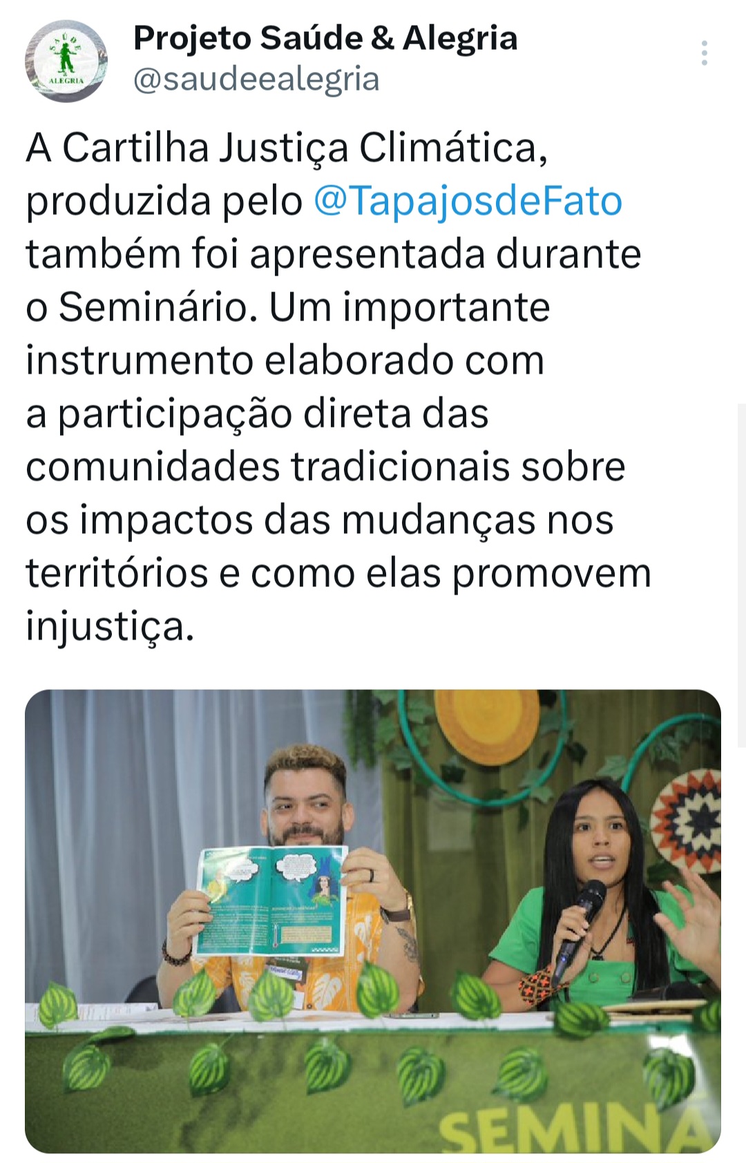 O evento contou com sistematização visual, onde foram ilustrados encaminhamentos e próximos passos. Também foi lançada a plataforma Vozes do Tapajós pela Ação Climática #vactapajos e apresentada durante o Seminário, a cartilha Justiça Climática, produzida pelo @tapajosdefato.