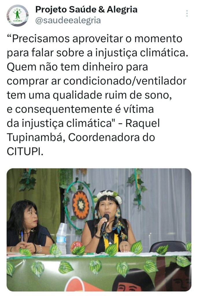 Por isso a injustiça climática foi outro tema que transitou na maioria das mesas. Se por um lado, muitos sacrificam incansavelmente para garantir o básico, por outro, uma minoria acumula vantagens sobre os mais vulneráveis. “Precisamos aproveitar o momento para falar sobre a injustiça climática. Quem não tem dinheiro para comprar ar condicionado/ventilador tem uma qualidade ruim de sono, e consequentemente é vítima da injustiça climática. Precisamos pensar em estratégias para combater isso” – disse Raquel Tupinambá, Coordenadora do Conselho Indígena Tupinambá – CITUPI.