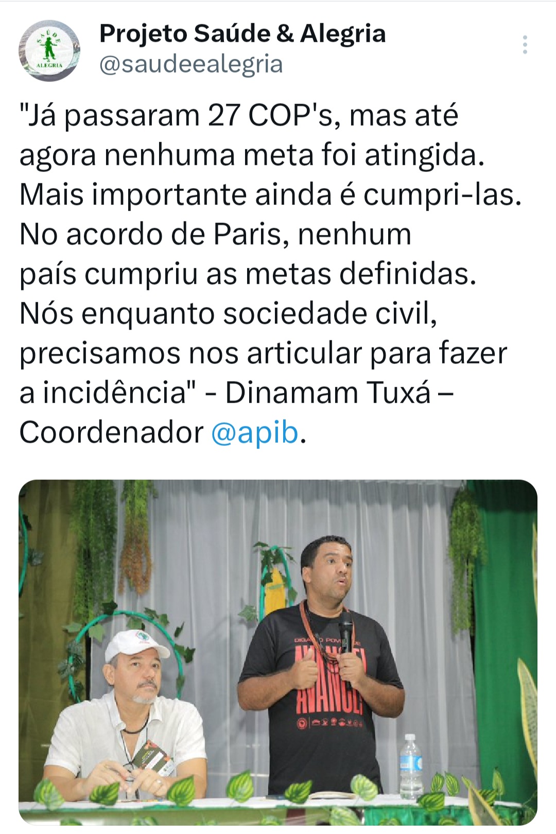 “Temos o desafio de furar essa bolha. O governo brasileiro tem o compromisso com as populações indígenas, porque nós somos parte da solução climática. Nós precisamos que ele inclua a gente no centro da discussão e na tomada de decisão”, destacou o Coordenador Nacional da APIB (Articulação dos Povos Indígenas do Brasil), Dinamam Tuxá.