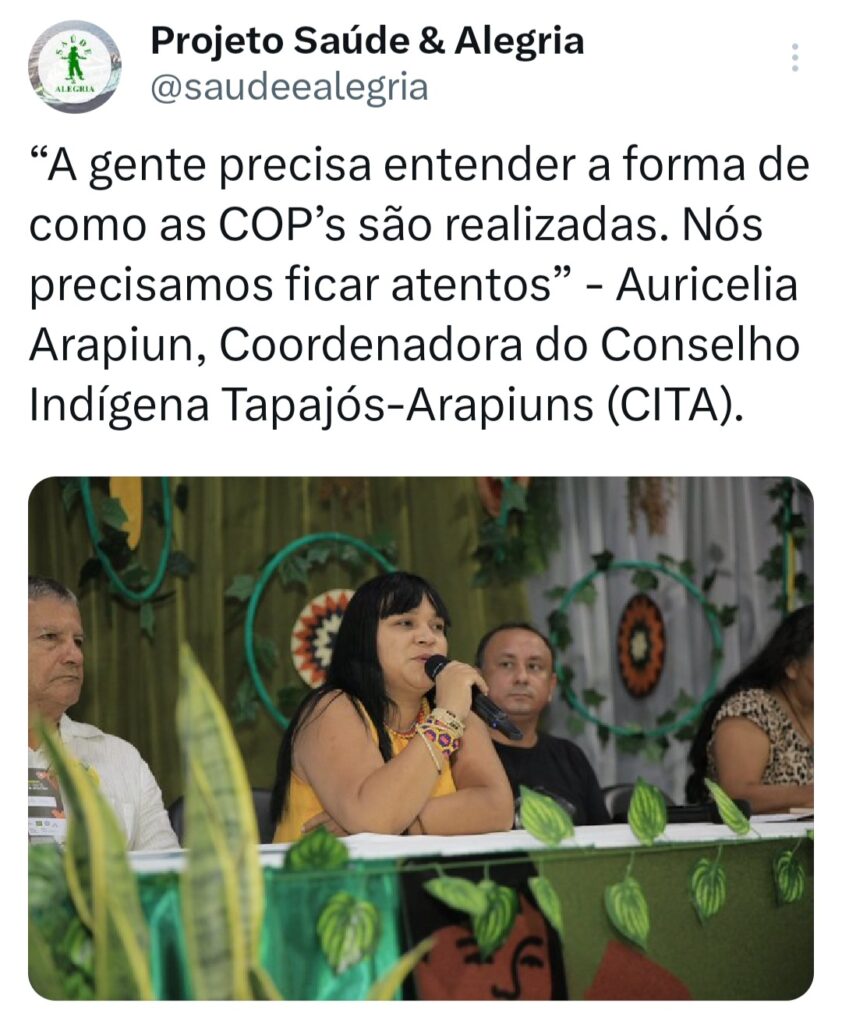 “A gente precisa entender a forma como as COP’s são realizadas. Nós precisamos ficar atentos” – Auricelia Arapiun, Coordenadora do Conselho Indígena Tapajós-Arapiuns (CITA).