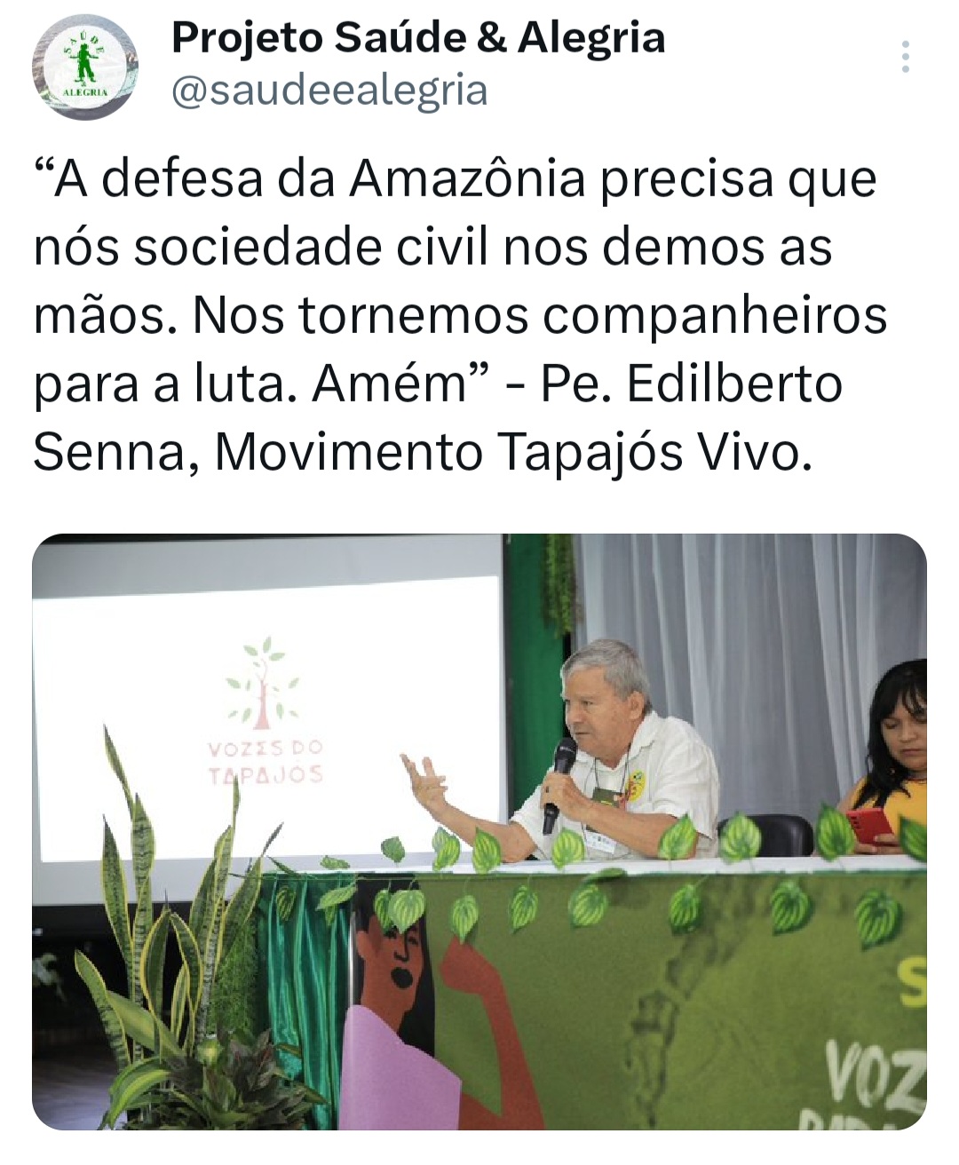“A defesa da Amazônia precisa que nós sociedade civil nos demos as mãos. Nos tornamos companheiros para a luta. Amém” – Edilberto Senna, Movimento Tapajós Vivo.