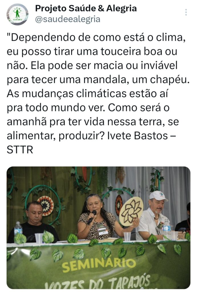 Uma das grandes preocupações dos povos da Amazônia é a aceleração das mudanças climáticas que tem afetado as atividades de subsistência. Ivete Bastos, produtora rural e presidente do STTR-STM, falou sobre o impacto dessas alterações para quem depende da Terra: “Dependendo de como está o tempo, eu posso tirar uma touceira boa ou não. Ela pode ser macia ou inviável para tecer uma mandala, um chapéu… As mudanças climáticas estão aí pra todo mundo ver. Eu sou uma mulher produtora rural, que adora ir pra feira vender produtos orgânicos. Como será o amanhã pra ter vida nessa terra, pra se alimentar, para produzir?”.